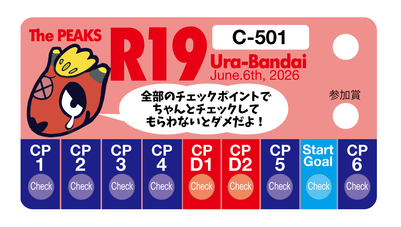 • スタートした参加者は、指定されたコース順通りに、すべてのチェックポイント(CP)で指定時間内にゼッケンカードにチェックを受けなければなりません。