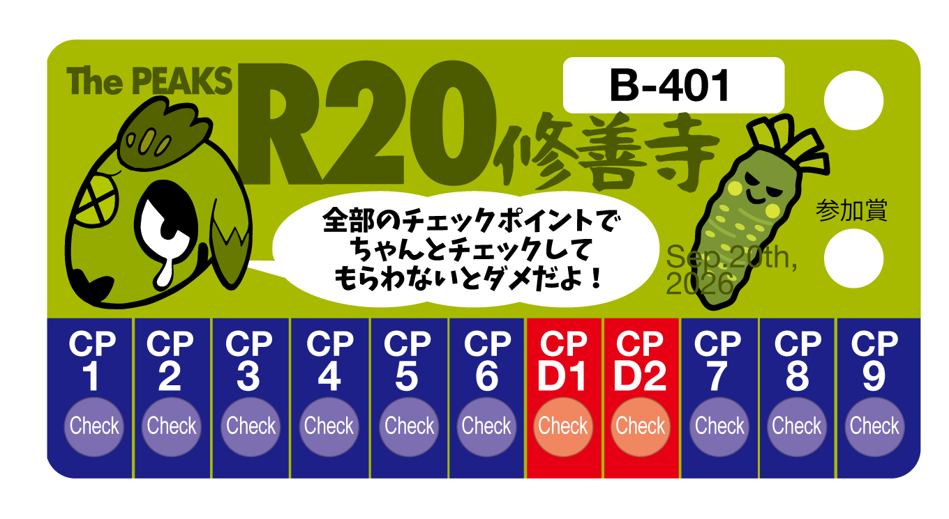 - スタートした参加者は、指定されたコース順通りに、すべてのチェックポイント(CP)で指定時間内にゼッケンカードにチェックを受けなければなりません。